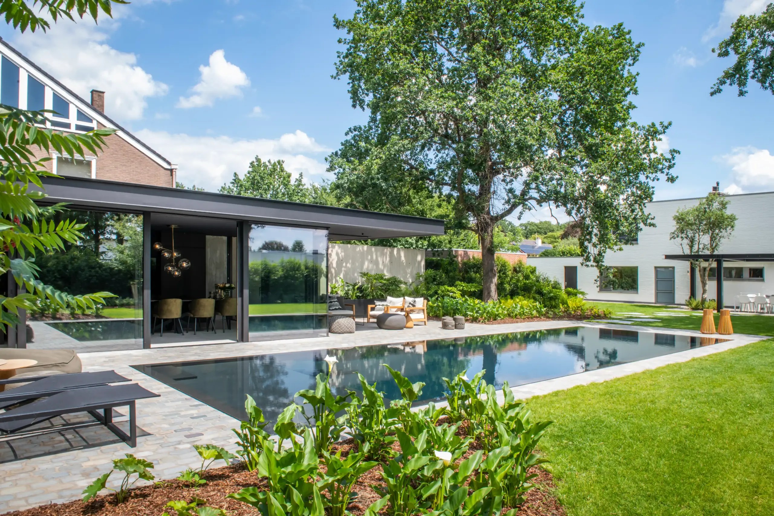 Exclusief buitenproject in Hasselt met Zesth Architecten en Valkenborgh Zwembaden: een strak overloopzwembad en poolhouse, harmonieus ingebed in het groen met verfijnde verharding en beplanting.